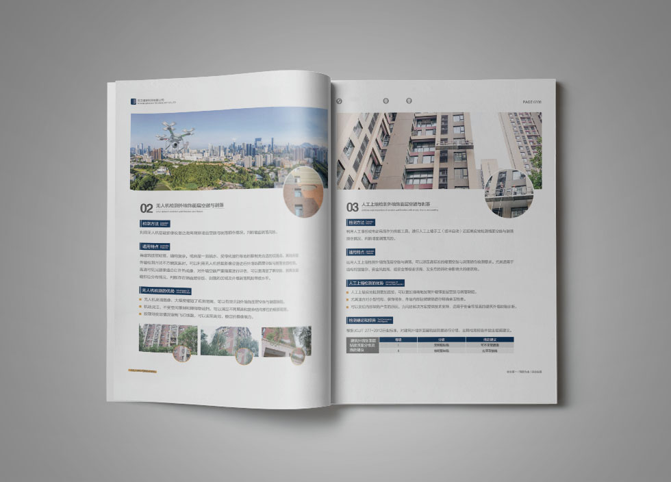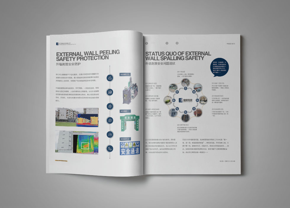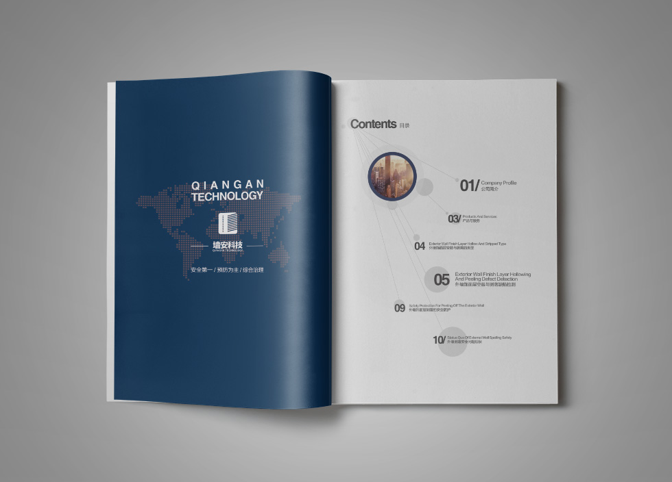 項目背景:武漢墻安科技有限公司是一家專業(yè)的房屋安全治理與維保服務(wù)商,以房屋外墻安全檢測與風(fēng)險預(yù)控為核心業(yè)務(wù),提供專業(yè)的外墻空鼓、剝離、脫落檢測,以及風(fēng)險評估、風(fēng)險控制、方案設(shè)計等服務(wù),為各類住宅、辦公寫字樓、工業(yè)廠房等房屋提供全壽命周期內(nèi)的持續(xù)性、全方位安全保障。艾的爾承接其畫冊設(shè)計制作,成立品牌設(shè)計小組,與企業(yè)進行深入溝通,明確企業(yè)對于畫冊設(shè)計的需求,通過對企業(yè)行業(yè)屬性和主要服務(wù)的深入了解和研究,在畫冊設(shè)計、創(chuàng)意的過程中,封面大膽留白,將重點突出“房屋外墻剝落安全治理專家”。