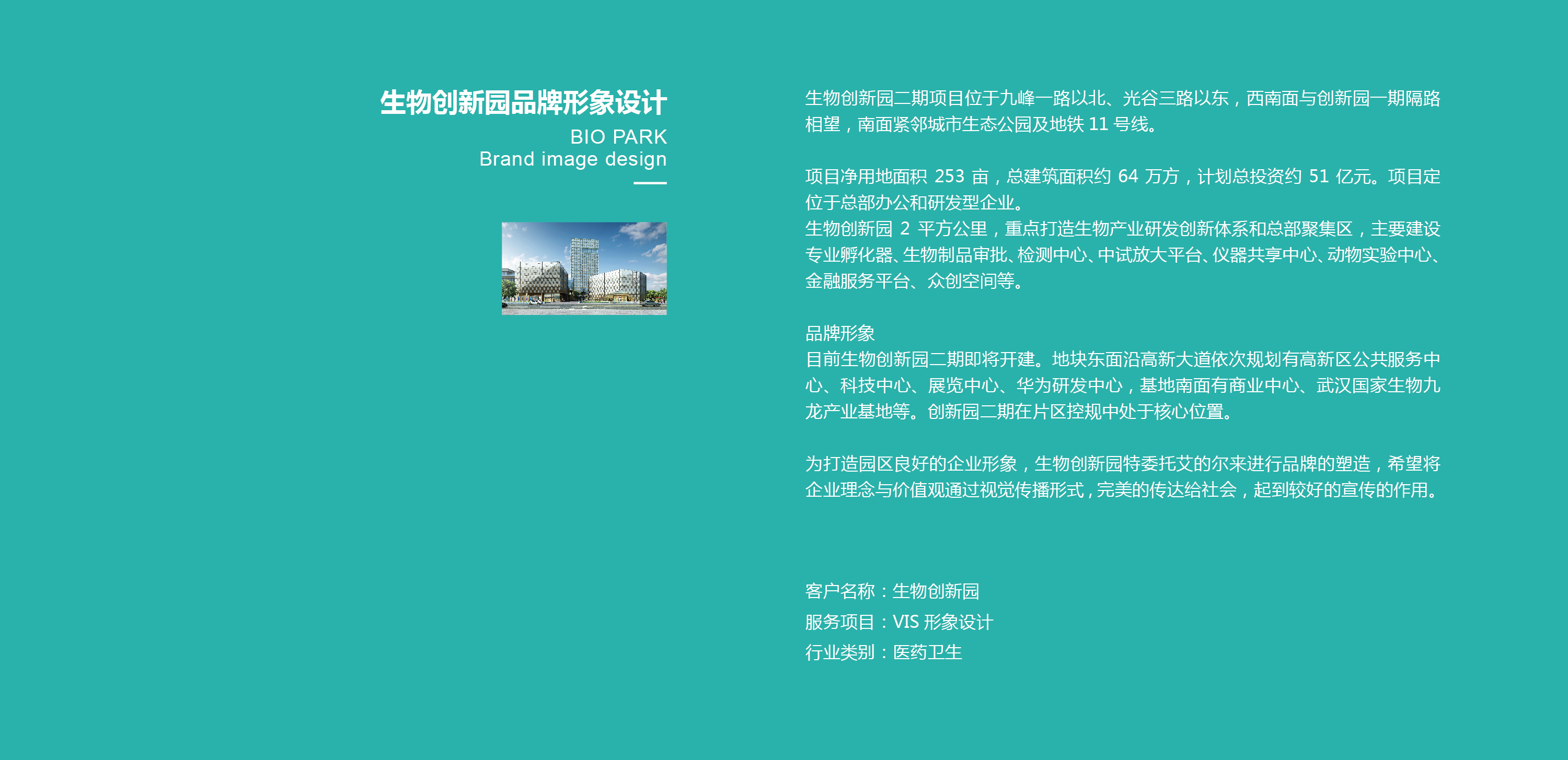 項(xiàng)目背景:生物創(chuàng)新園所屬湖北省科技投資集團(tuán)有限公司,生物創(chuàng)新園2平方公里,重點(diǎn)打造生物產(chǎn)業(yè)研發(fā)創(chuàng)新體系和總部聚集區(qū),主要建設(shè)專業(yè)孵化器、生物制品審批、檢測中心、中試放大平臺、儀器共享中心、動(dòng)物實(shí)驗(yàn)中心、金融服務(wù)平臺、眾創(chuàng)空間等。艾的爾承接其品牌形象設(shè)計(jì),在設(shè)計(jì)時(shí)融入了廣聚人才的概念,錯(cuò)落成四個(gè)區(qū)塊,用兩種不同的色彩將色塊加以區(qū)分,形成視覺上的疊加融合,整體上演繹出“延伸”、“發(fā)散”、“無限”、“環(huán)保科技”、“全球化”等寓意,寄喻事業(yè)興旺,朝氣蓬勃。整體體現(xiàn)了企業(yè)穩(wěn)重大氣的品牌氣質(zhì),與時(shí)俱進(jìn),開拓未來。設(shè)計(jì)團(tuán)隊(duì)在有效的時(shí)間內(nèi)完成設(shè)計(jì)制作,項(xiàng)目獲得了客戶驗(yàn)收,最終讓設(shè)計(jì)完美的呈現(xiàn)出來。