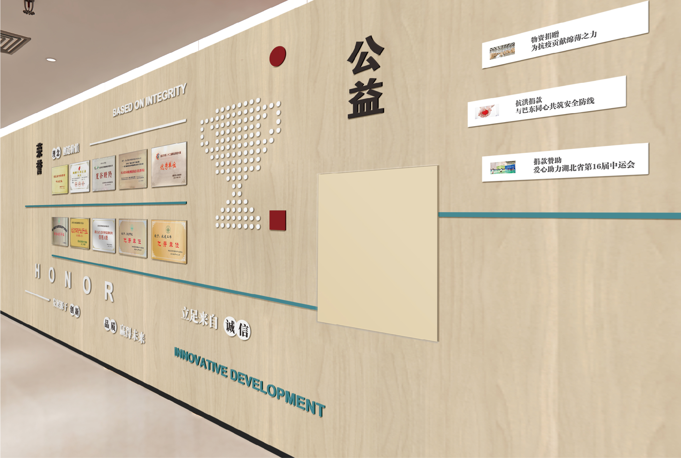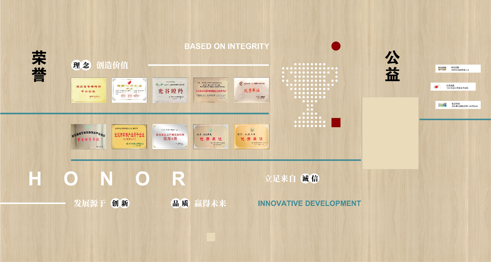 項目背景:華正環(huán)境是一家專業(yè)從事環(huán)境檢測并基于環(huán)境檢測開展環(huán)境咨詢服務(wù)的高新技術(shù)企業(yè), 成立于2013年,總部位于武漢市東湖高新技術(shù)開發(fā)區(qū)。旗下設(shè)有武漢華正、江西慧正、寧夏華正、宜昌華正、襄陽華正等5個標(biāo)準(zhǔn)化實驗室以及華正環(huán)境研究院、湖北葦杭環(huán)??萍加邢薰镜葘I(yè)的環(huán)境咨詢服務(wù)機(jī)構(gòu)。 經(jīng)過近10年的發(fā)展,“華正環(huán)境”依托自有具有規(guī)?;牡谌江h(huán)境檢測平臺,構(gòu)建特色鮮明、優(yōu)勢互補(bǔ)的環(huán)境檢測和環(huán)境咨詢“雙輪驅(qū)動(T+C)”發(fā)展模式。全方位為政府、園區(qū)、企業(yè)提供 “一站式”第三方環(huán)境綜合服務(wù),統(tǒng)籌解決各方面環(huán)境問題。服務(wù)范圍覆蓋華中及中西部地區(qū)多個省份,為近萬家客戶提供各類“環(huán)境檢測”和“環(huán)境咨詢” 綜合解決方案。艾的爾品牌設(shè)計承接其文化墻設(shè)計,與客戶深入溝通后,結(jié)合企業(yè)自身特點,從企業(yè)簡介,發(fā)展歷程,使命,愿景,榮譽(yù),公益等出發(fā),內(nèi)容簡潔明了、主題突出。