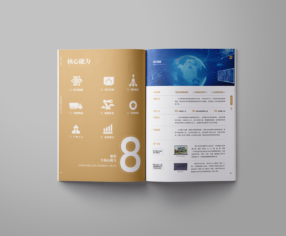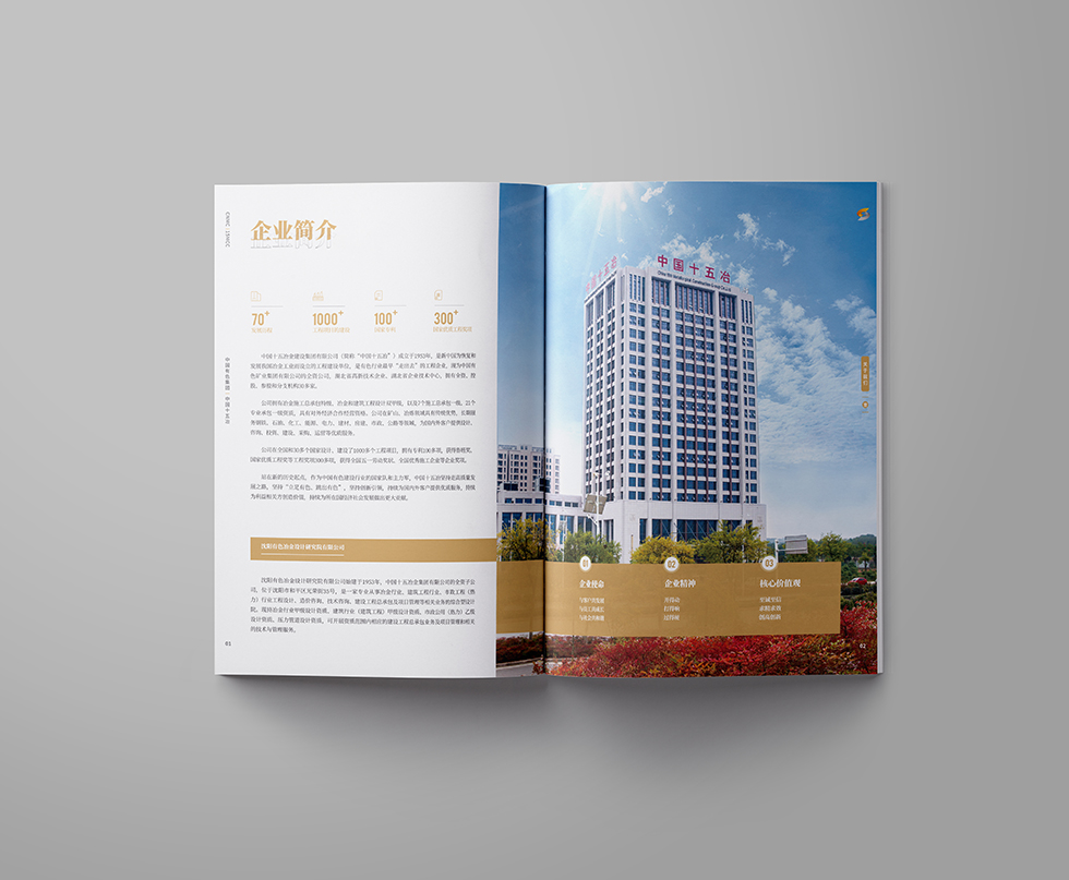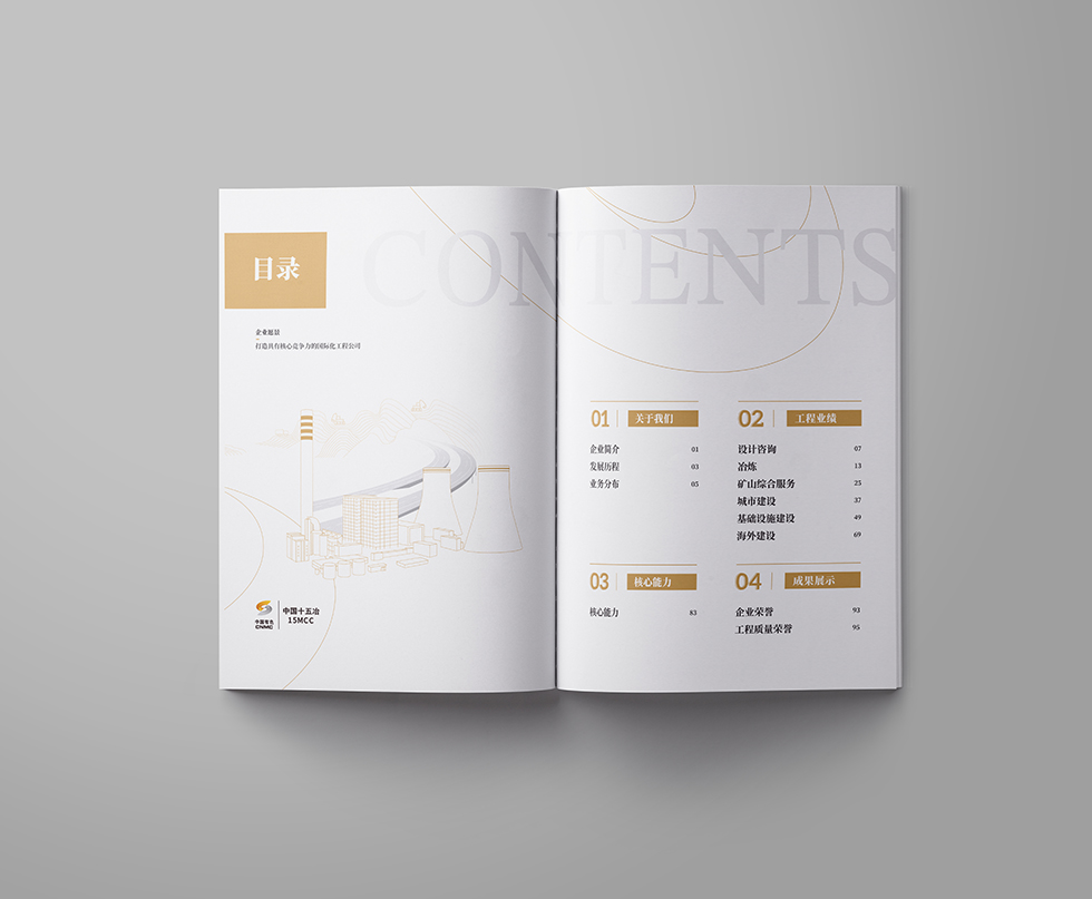 項(xiàng)目背景:中國(guó)十五冶金建設(shè)有限公司(簡(jiǎn)稱“中國(guó)十五冶”)是具有特級(jí)總承包資質(zhì)的大型國(guó)有施工企業(yè),隸屬于國(guó)務(wù)院國(guó)資委直管的中國(guó)有色礦業(yè)集團(tuán)有限公司。中國(guó)十五冶成立于1953年,現(xiàn)有資產(chǎn)40余億元,從業(yè)人員2萬(wàn)余人,其中核心管理人員約5000人;擁有施工機(jī)械設(shè)備4998臺(tái)(套),動(dòng)力裝備率為31.75kw/人,技術(shù)裝備率為130372元/人。公司擁有冶煉工程總承包特級(jí)資質(zhì),礦山工程、電力工程、公路工程、房屋建筑工程、機(jī)電安裝工程、石油化工工程、市政工程等7項(xiàng)總承包一級(jí)資質(zhì)及5項(xiàng)專業(yè)資質(zhì)。同時(shí),還具有對(duì)外經(jīng)濟(jì)合作經(jīng)營(yíng)資格、進(jìn)出口企業(yè)資格和對(duì)外援助成套項(xiàng)目施工任務(wù)A級(jí)實(shí)施企業(yè)資格,可從事境外承包工程、輸出勞務(wù)和相關(guān)進(jìn)出口業(yè)務(wù)。艾的爾設(shè)計(jì)承接其畫冊(cè)設(shè)計(jì),成立品牌設(shè)計(jì)小組,與企業(yè)進(jìn)行深入溝通,明確企業(yè)對(duì)于畫冊(cè)設(shè)計(jì)的需求,封面大面留白,整體顯得干凈、大氣、識(shí)別性更強(qiáng),第一眼就能清晰明了的看到主題字。內(nèi)頁(yè)也是白色風(fēng)格為主,清晰的看到二級(jí)標(biāo)題與內(nèi)容,能夠突出企業(yè)的畫冊(cè)宣傳內(nèi)容。